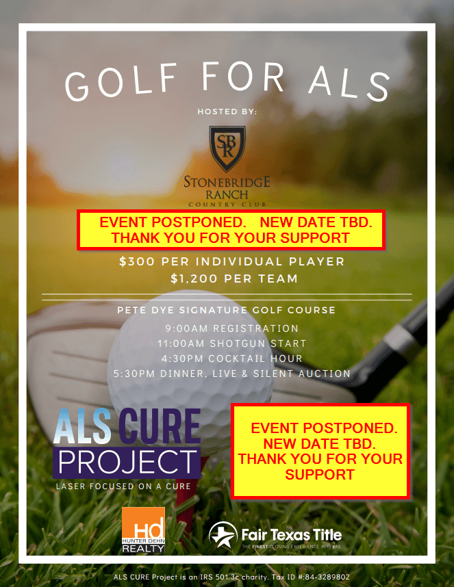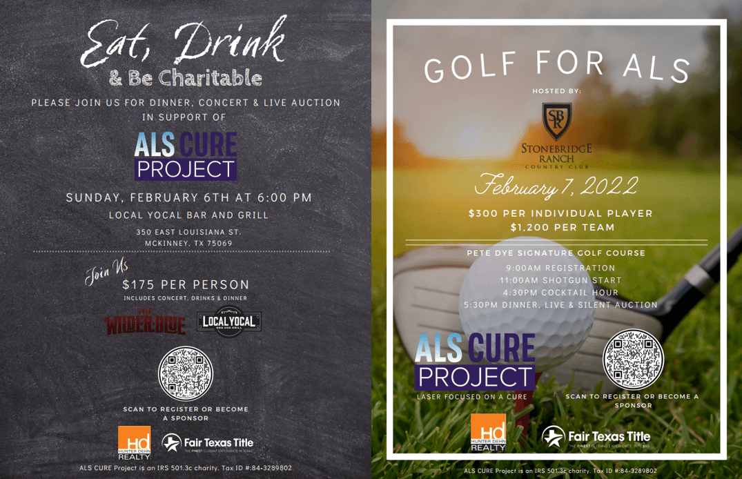 The ALS Cure Project will be holding it's first fundraising events of 2022 with a dinner & live concert and Golf tournament at the Pete Dye designed Stonebridge Ranch golf course, in McKinney, TX, on Oct 9th & 10th 2022 respectively.